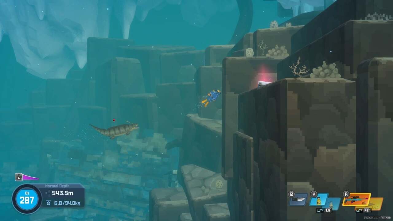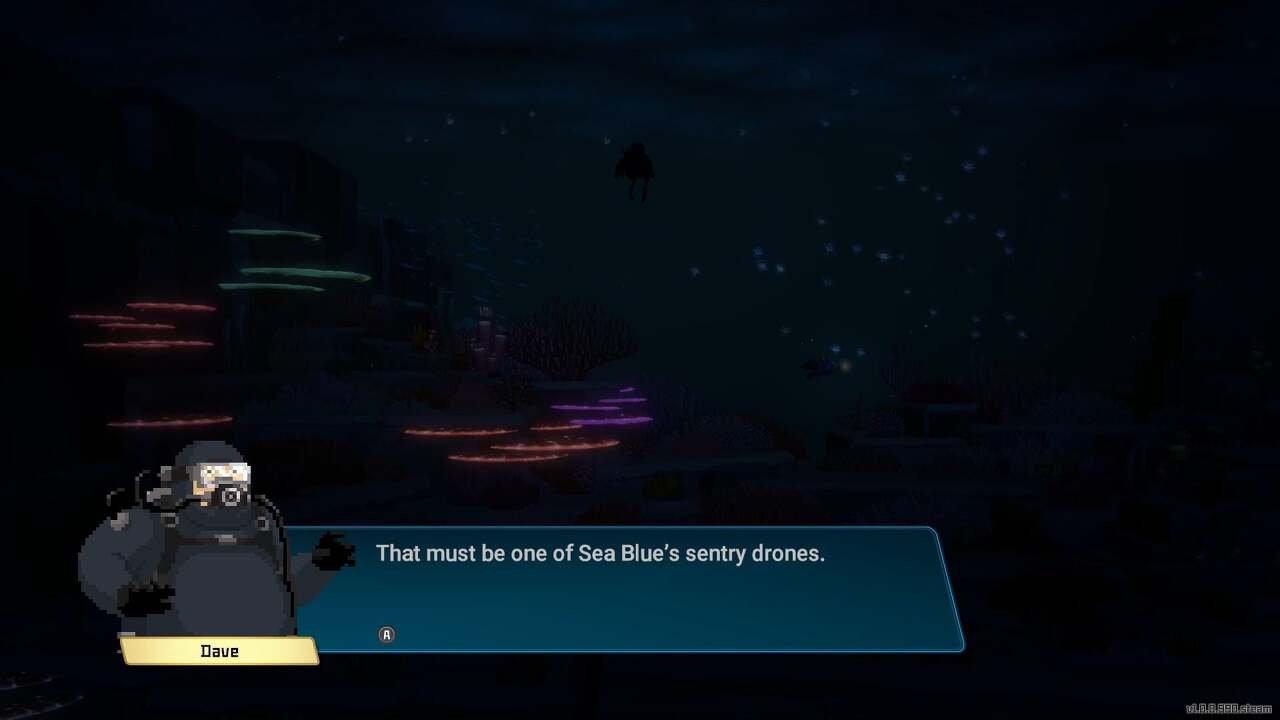 만약 맞았다면 걱정하지 마세요. 당신을 공격하는 적대적인 물고기로부터 벗어나 안전한 거리에서 드론을 계속 따라가십시오. 결국 드론은 숨겨진 Sea Blue 기지 입구까지 올 것이고, 데이브는 드론을 따라 안으로 들어갈 것입니다.