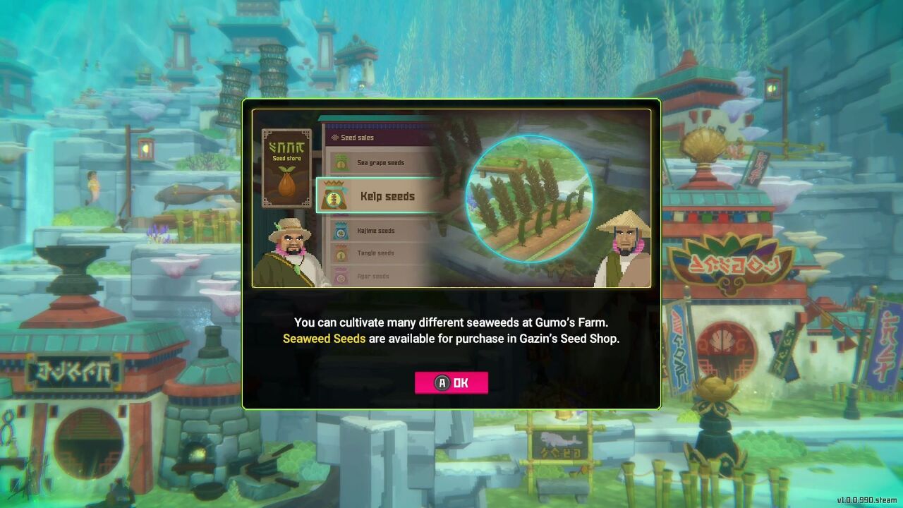 이전에 챕터 3 에서 바다사람 식물 키우기를 완료했다면 바다사람 마을에 있는 구모와 대화하세요. 이제 해초 농장이 개장됩니다. 씨앗 상점의 가지진에게서 씨앗을 구입해 해초 농장에 심으면 직접 채취하지 않고도 해초를 얻을 수 있습니다.