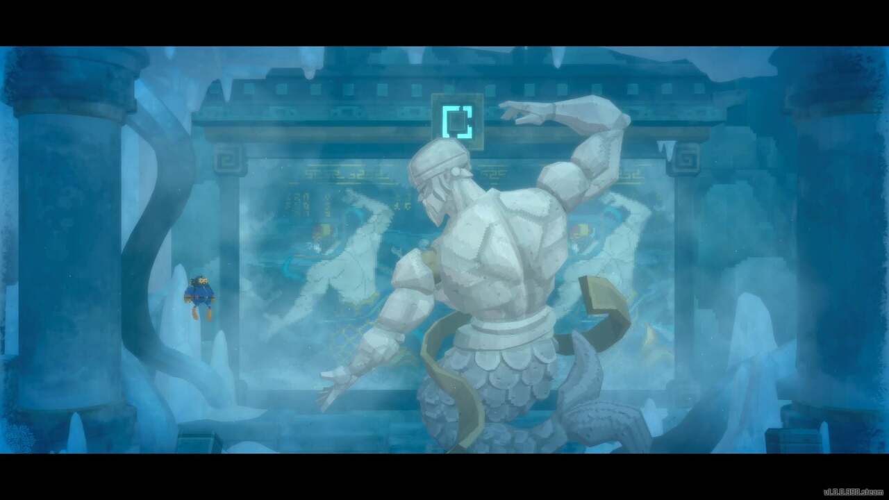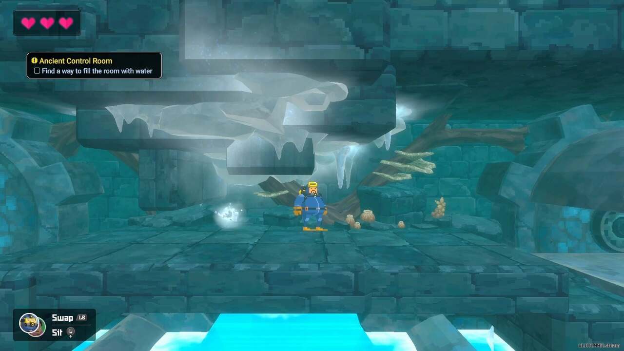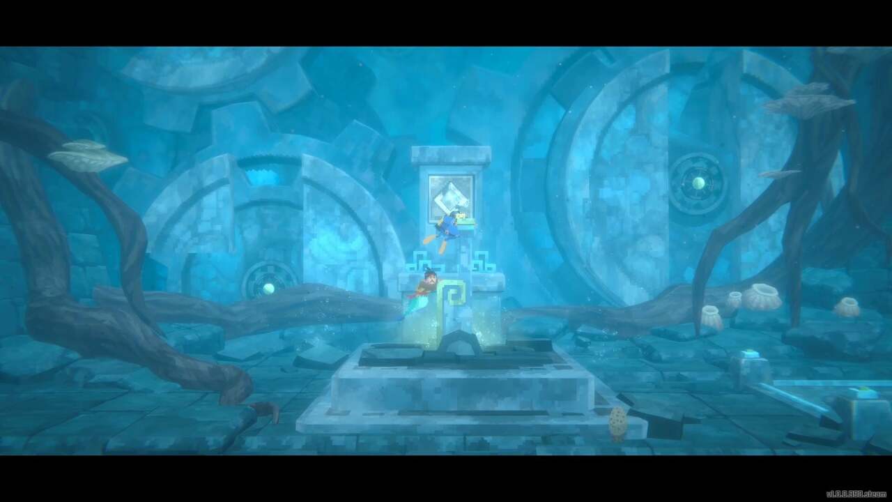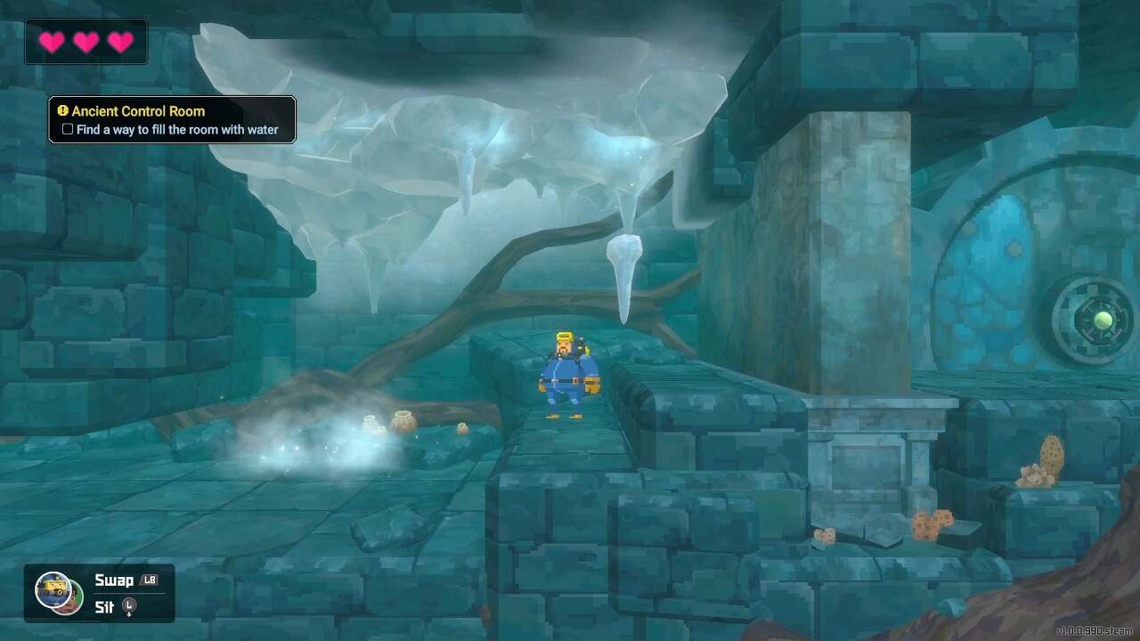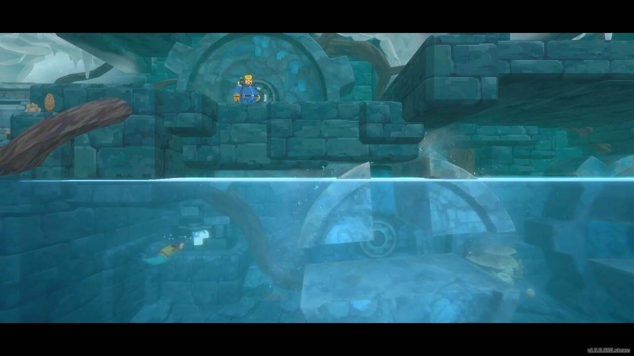 다음 방에 도착하면 수영하여 한 캐릭터가 길을 막고 있는 돌 플랫폼 아래의 사슬과 상호 작용하도록 하세요. 이 플랫폼을 우산으로 사용하여 떨어지는 얼음 조각을 막고 왼쪽 위로 계속 이동하세요.