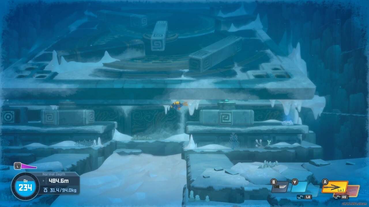 다시 수영하여 수왐(Suwam)으로 돌아가서 안에 있는 원형 장치의 버튼을 누르세요. 다시 회전하면 오른쪽으로 헤엄쳐서 아래로 내려가세요. 천장에 있는 얼음 조각을 조심하세요. 패키지 왼쪽 아래에 있는 알코브에 숨어서 피할 수 있습니다.
