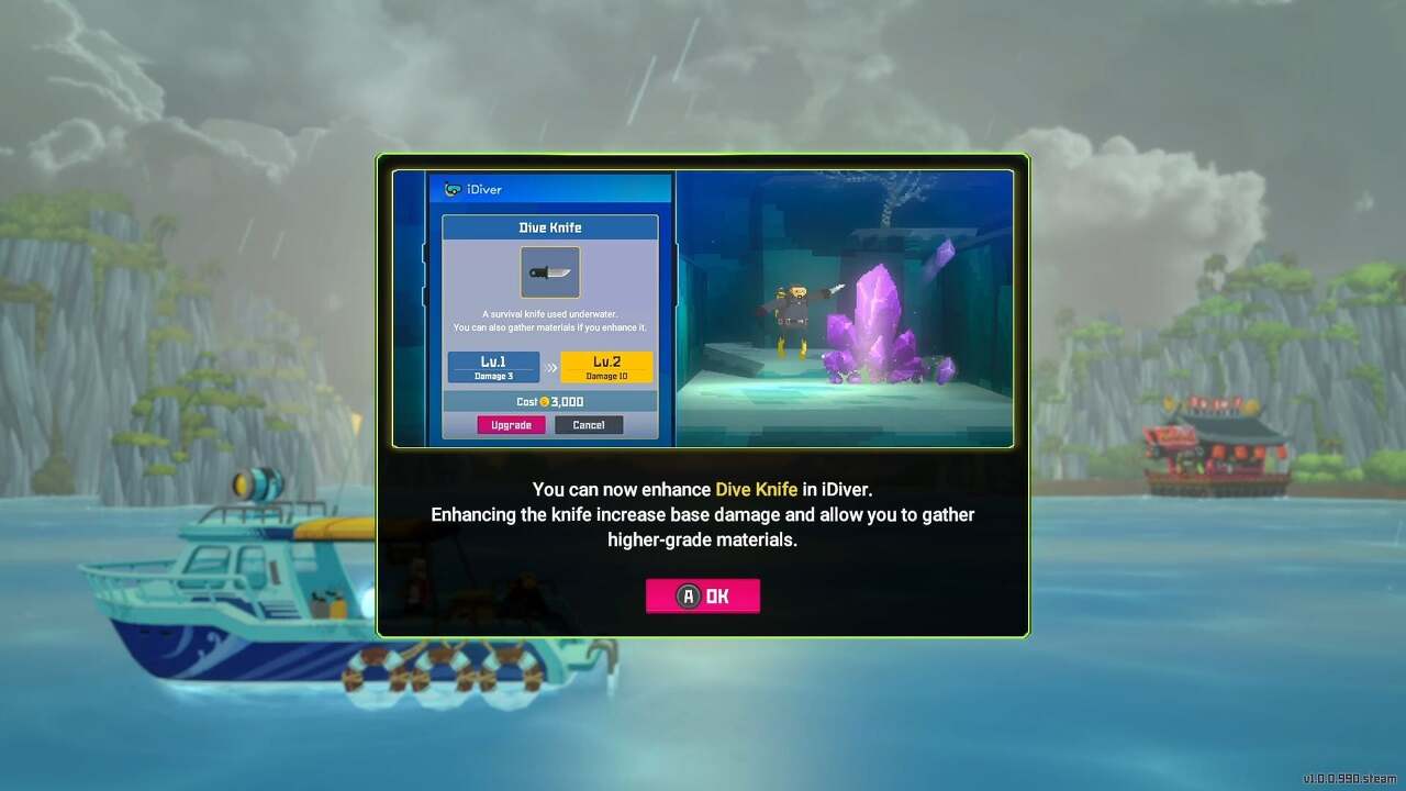 다음날 베이컨 박사가 당신에게 내한성 잠수복을 만들어 줄 수 있도록 기계 부품을 수집하러 들를 것입니다. 그는 또한 빙하 지역으로 모험을 떠나기 전에 강력한 무기를 얻을 것을 권장하며, 이제 iDiver 앱을 통해 다이빙 나이프를 업데이트할 수 있다고 알려줍니다. 충분히 업그레이드하면 이전에는 곡괭이가 필요했던 광물을 채굴하는 데 사용할 수 있습니다.