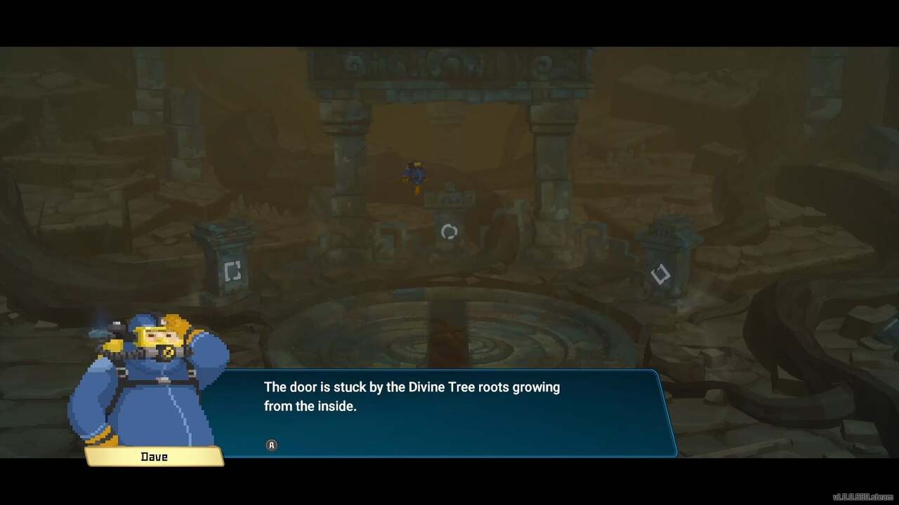 해류를 지나면 원형 장치를 통과하여 길을 따라 올라가서 레버가 있는 왼쪽으로 가세요. 마우스 오른쪽 버튼이나 오른쪽 트리거를 사용하여 레버를 당겨 데이브의 길을 막고 있는 또 다른 석판을 낮추세요.