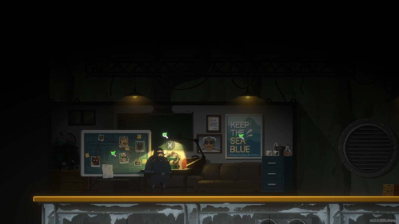 배급이 끝나면 바로 사무실로 통하는 문이 나옵니다. 스페이스바 또는 X/사각형을 눌러 문을 열고 바다색 포스터를 살펴본 다음 데이브의 사진이 있는 칠판을 살펴보세요. 그 후, 책상 위의 기계 부품을 살펴보세요.