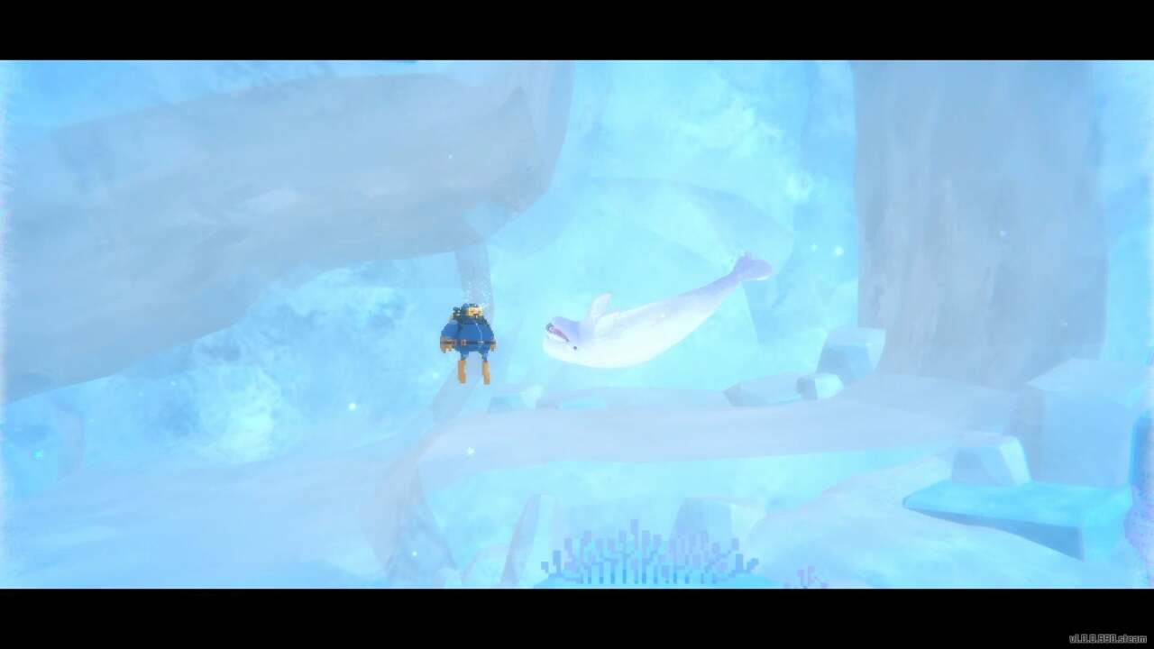 조금 더 가면 터널의 분기점에 도달하게 됩니다. 한 길은 위로 이어지고, 다른 길은 아래로 이어집니다. 그럴 때는 아래로 이어지는 길을 택하세요. 잠시 수영을 하고 나면 얼음 위에 누워 있는 벨루가를 만나게 됩니다.