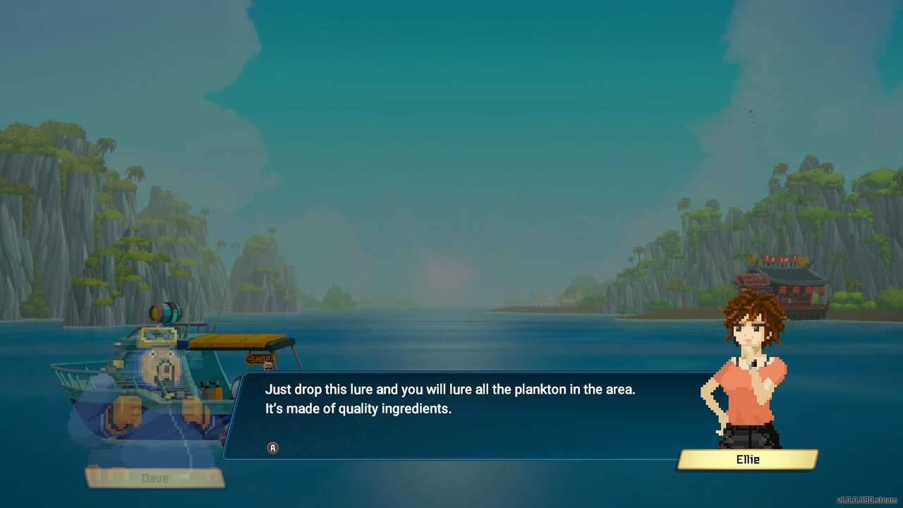 미끼를 만들려면 다시마 5개가 필요합니다 . 아마도 이미 가지고 있을 수도 있지만, 그렇지 않다면 수심 50~130피트 사이의 해저에서 찾을 수 있습니다. 그것을 얻으면 Ellie가 다시 전화를 걸어 자신이 만든 미끼를 줄 것입니다.