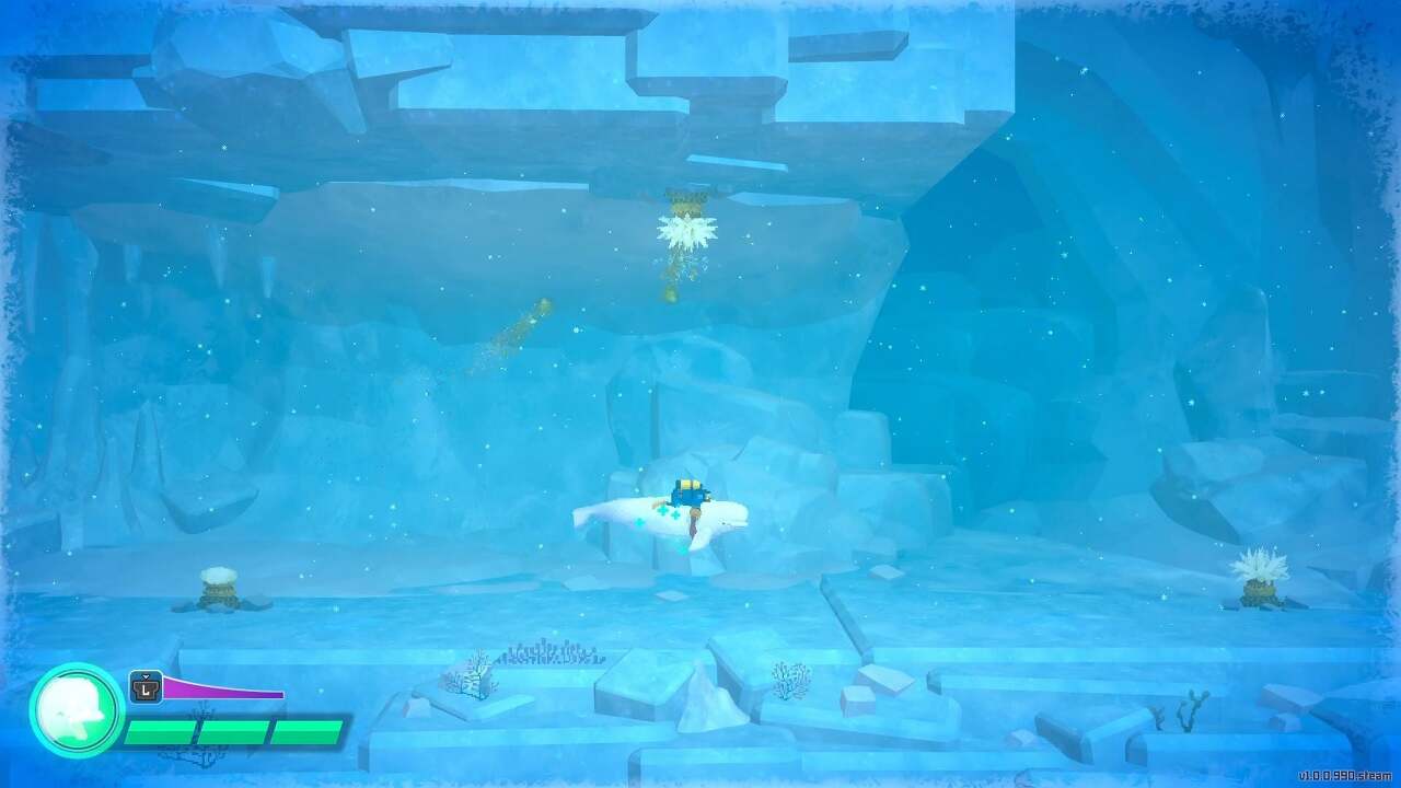또 다른 성게를 지나면 돌파해야 할 또 다른 얼음벽이 보입니다. 얼음벽 바로 뒤에 갈색 구멍에서 나오는 검은 해파리가 있습니다. 흰색 해파리와는 달리, 이 검은 해파리는 일정 거리를 이동하거나 접촉한 후(둘 중 먼저 도래하는 시점)를 쫓아 탐색합니다. 그들을 피하기 위해 가능한 한 빨리 그들로부터 멀리 수영하세요.