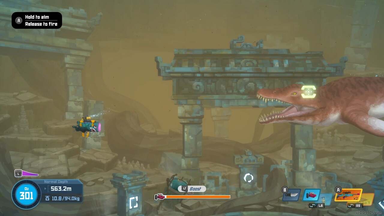 크로노사우루스에는 불 숨결 공격도 있습니다. 처음에는 그의 진공 공격과 매우 비슷해 보이지만 그의 입에서 불이 생기기 시작하는 것을 보면 차이점을 알 수 있을 것입니다. 이 공격을 피하려면 크로노사우루스를 향해 수영하고 최대한 빨리 위로 올라가세요. 화면 하단에서 불이 시작되어 위로 올라갑니다. 위로 헤엄쳐 올라가기만 해도 각도 때문에 여전히 맞을 수 있습니다. 미사일 발사기를 잡고 있다면 떨어뜨리십시오. 그렇지 않으면 그것을 피할 만큼 빠르지 않을 것입니다.