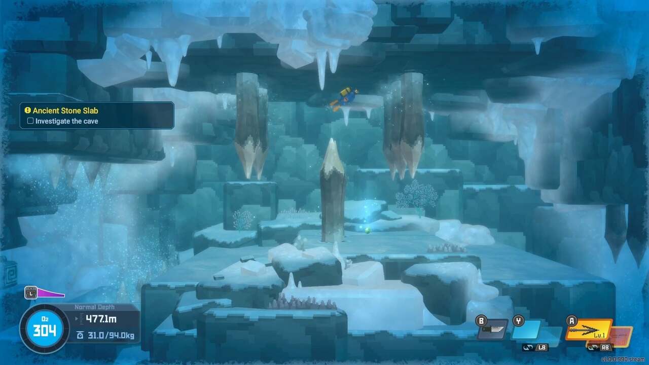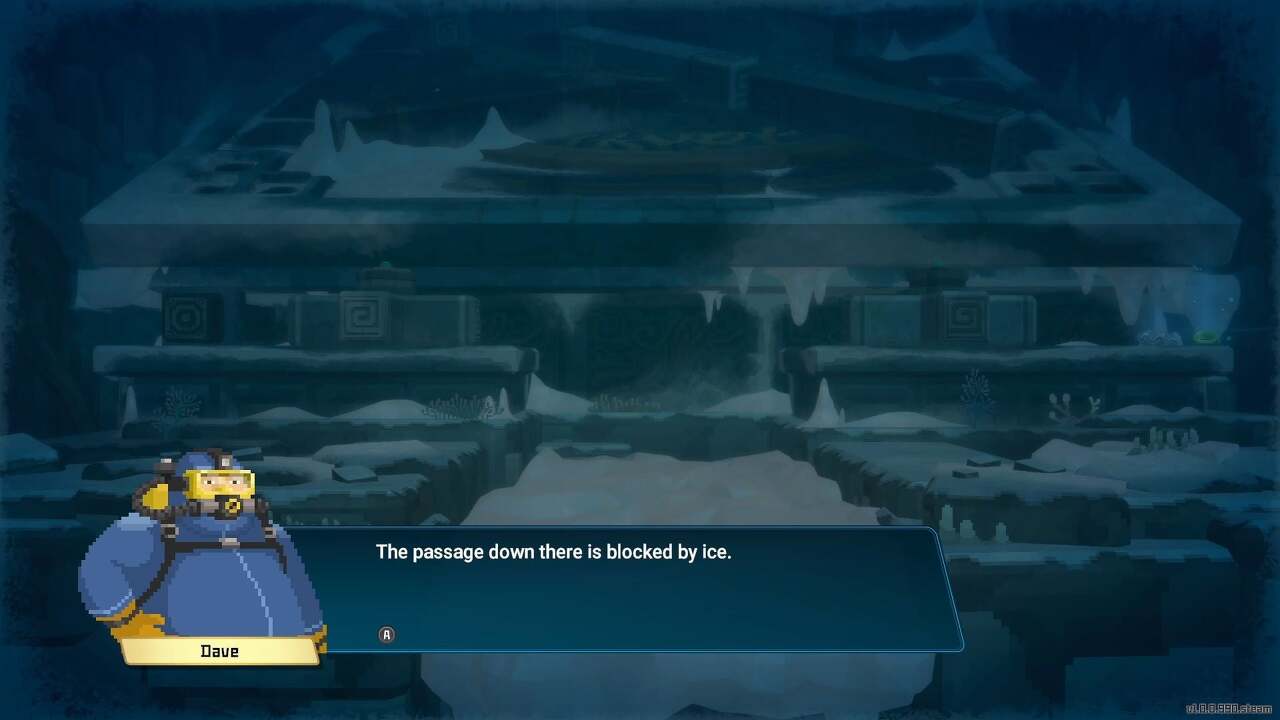 다시 데이브로 전환하여 앞에 있는 선반을 오르고, 앞에 있는 석판 아래로 웅크린 채 걸어가서 스위치를 밟으세요. 이것은 데이브 주변의 얼음을 녹이고 마침내 수위를 높일 것입니다.