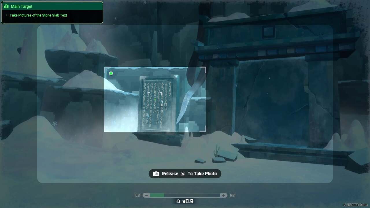 좋은 사진을 얻으려면 약 0.9로 축소하세요. 언제나 그렇듯이, 사진을 찍기 전에 프레임 왼쪽 상단에 있는 녹색 점을 사용하여 사진이 잘 찍혔는지 확인하세요. 완료되면 원하는 만큼 탐색하고 표면으로 돌아가서 베이컨 박사에게 보여주세요. 이것으로 빙하 지역 탐험 임무가 완료됩니다.