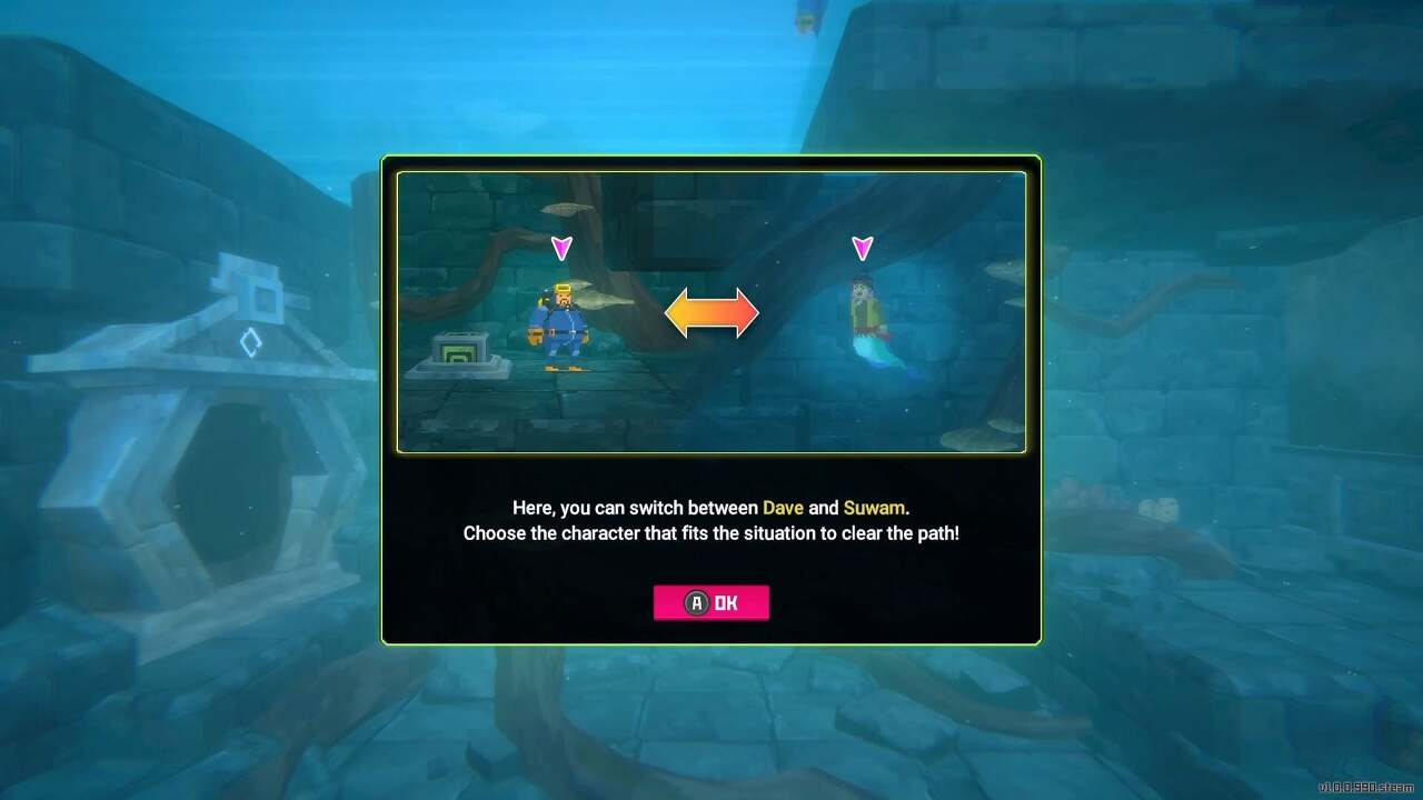 이 섹션에서 Suwam과 데이브를 제어하게 되며, 화면 왼쪽 하단에 있는 "전환"이라고 표시된 버튼을 눌러 언제든지 둘 사이를 전환할 수 있습니다. 시작하려면 데이브로 전환하고 오른쪽으로 가세요. 데이브가 올라가거나 내려가게 하려면 스페이스바나 X/사각형을 눌러야 합니다. 화면 오른쪽에 있는 스위치로 그를 데려가서 그 위에 서게 하세요.