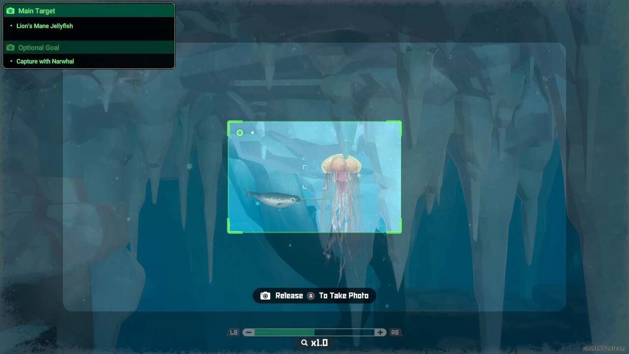 포토스팟으로 가서 사진 촬영 준비를 합니다. 이 경우에는 확대하거나 축소할 필요가 없습니다. 해파리가 프레임 오른쪽에 있는지 확인한 다음 일각고래가 순환을 마치고 돌아서 오른쪽으로 헤엄칠 때까지 기다립니다. 그가 프레임 안에 들어오면 사진을 찍어보세요.
