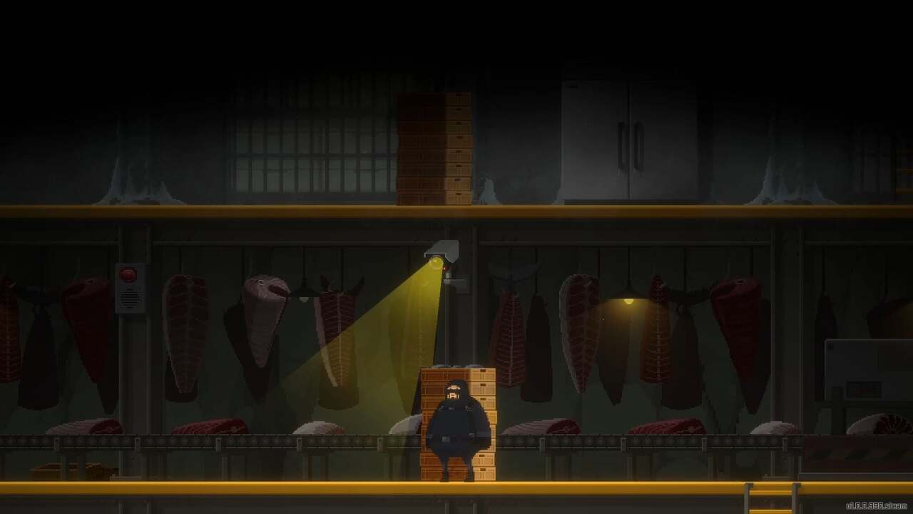 다음 섹션에서는 완벽한 타이밍과 약간의 행운 이상이 필요합니다. 본질적으로 당신은 당신을 탐지할 수 있는 세 가지 사이에 갇혀 있습니다. 방금 지나간 왼쪽의 경비원, 카메라, 오른쪽의 또 다른 경비원. 카메라를 피하려면 상자 더미 뒤에 숨어야 하지만, 거기에 너무 오래 머무르면 오른쪽에 있는 경비원이 당신을 발견할 것입니다.