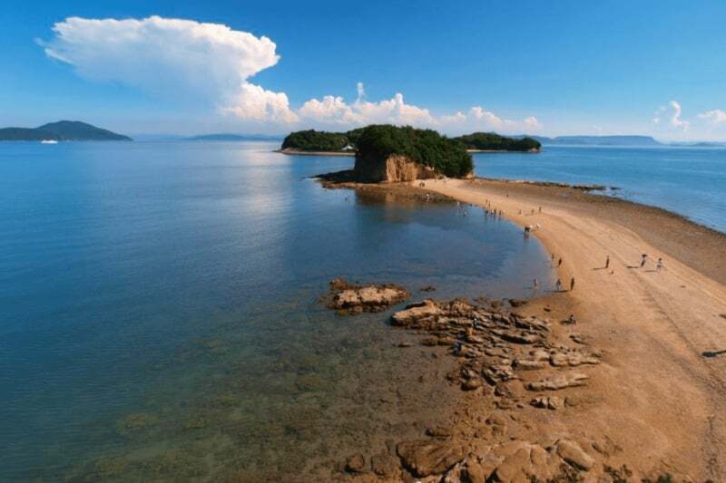 엔젤 로드(Angel Road) 는 토노쇼 항구(Tonosho Port) 근처의 모래톱으로 쇼도시마에서 가장 유명한 목적지라고 할 수 있습니다. 썰물 때에는 본섬과 이어진 작은 섬들도 볼 수 있고, 걸어서 갈 수도 있다. 그런 다음 쇼도 시마 올리브 공원을 산책 하고 간 카케이 협곡 의 초현실적인 협곡을 감상하세요 .