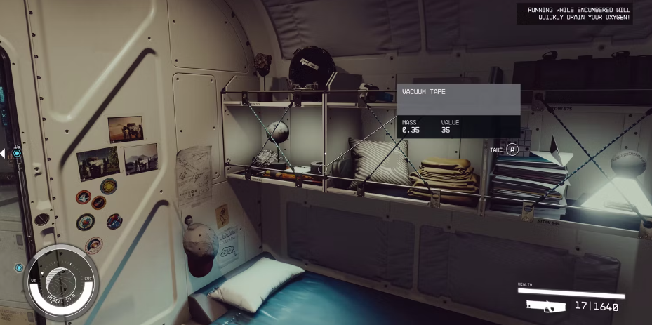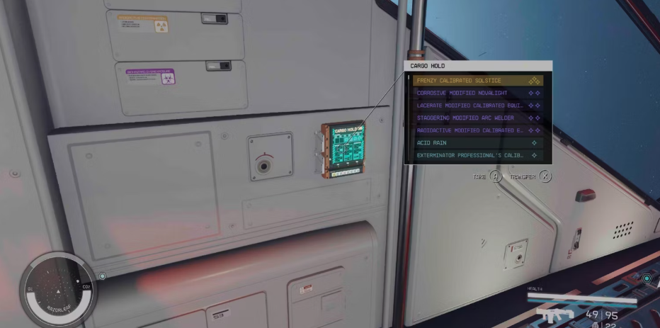 방해가 되는 상태를 피하려면 플레이어는 스타쉽에 약탈된 아이템을 떨어뜨려야 합니다. 게임의 각 우주선에는 플레이어가 잉여 소지품을 보관할 수 있는 화물창이 장착되어 있습니다. 이 창고의 장점은 배 근처에 있지 않아도 자동판매기를 통해 접근할 수 있다는 점이다. 플레이어는 또한 소지품을 별장에서 내리거나 동료에게 나누어 보관할 수 있습니다.