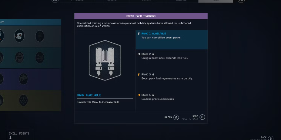 플레이어는 부스트 팩 스킬을 먼저 얻으 려면 몇 가지 스킬 포인트를 모아야 합니다. 이 능력이 없으면 제트팩을 활용할 수 없으므로 필수 특전이 됩니다. 이는 캐릭터 생성 중에 제트팩 관련 특전이나 배경을 선택하지 않은 사람들에게 특히 중요합니다.