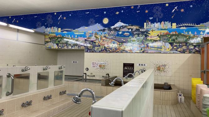 다이쇼의 끝에 창업해, 쇼와로 바뀌었을 때에 현재의 이름으로 개명. 뭐니뭐니해도 탈의소의 천장 일면을 덮는 스페이시한 그림이 강렬한 임팩트다. 한편, 목욕탕, 월풀, 약욕탕 등이 늘어선 목욕탕의 벽은 유원지 같은 즐거운 밤의 거리.