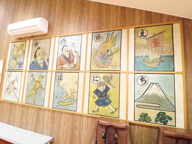 쇼와 26년(1951년) 창업 당시, 간판 장인에 의해 그려진 카르타 그림이 즐비!