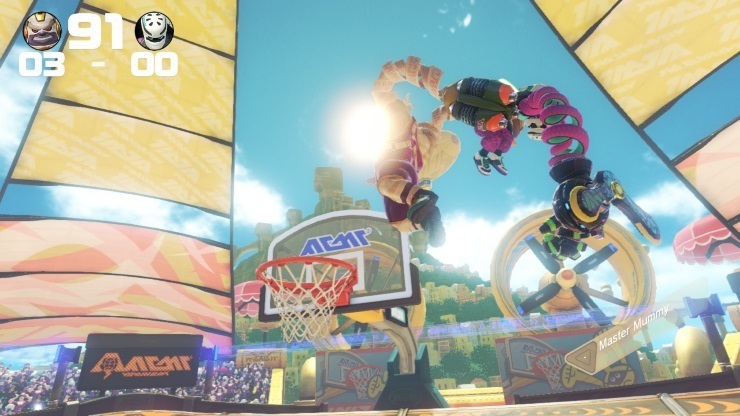 전투는 빠르게 전투기 간의 주고받기의 긴장된 패턴이 되며, 단순히 암즈(ARMS)를 쏟아 붓는 것보다 훨씬 더 전술적이고 반응적입니다. 공격과 방어에 대응하는 것은 자신의 초기 공격과 방어보다 훨씬 더 중요합니다. 각각의 펀치, 잡기, 블록이 잠재적인 기회가 되기 때문입니다. 적절한 타이밍과 조작을 통해 땅에 닿는 동안 던져지는 모든 것을 피할 수 있습니다. 이것도 상당히 단순한 격투 게임 역학처럼 보이지만 암즈(ARMS)와 펀치의 궤적 사이의 차이가 작용하는 곳이 바로 여기입니다.