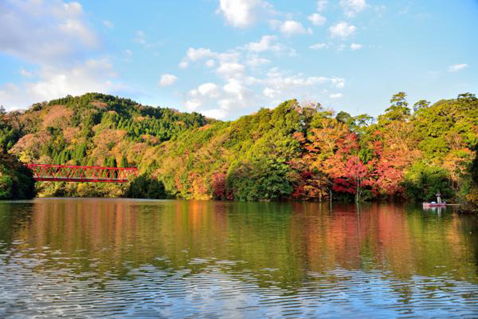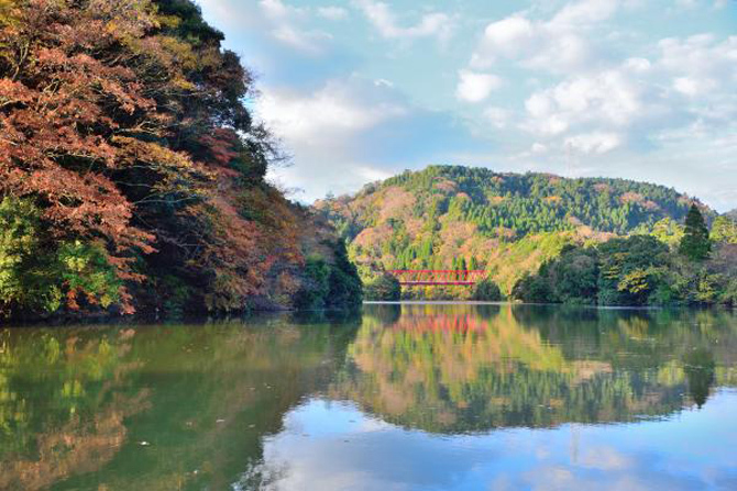 혼슈 중에서도 늦은 시기에 단풍을 볼 수 있는 기미쓰시의 가메야마 지역에 위치한 '가메야마 호수'. 사계절의 풍부한 호수와 그것을 둘러싼 자연 공원, 호반 주변과 계곡의 경치도 훌륭합니다.