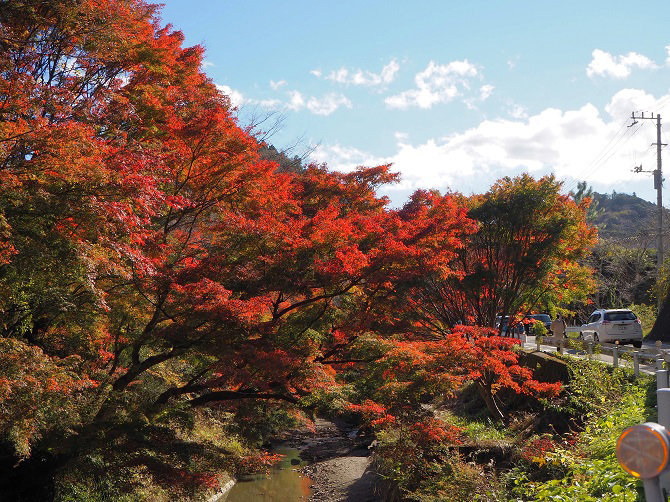 단풍시기의 볼거리는 “모미지의 터널”이나 절벽 위에 펼쳐지는 화려한 나무들. 그 밖에도, 메이지의 위인 히다카 성실(노부자네)의 거주가 있었다고 하는, 히다카 저택에 있는 3개의 모미지의 큰 나무도 압권입니다.