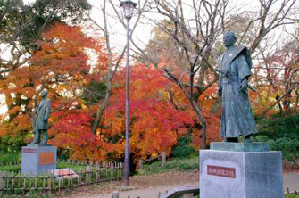 「다무로 미야코테이」전에 설치되어 있는 호리다 마사히코의 동상과 단풍의 콜라보레이션도 즐길 수 있습니다.