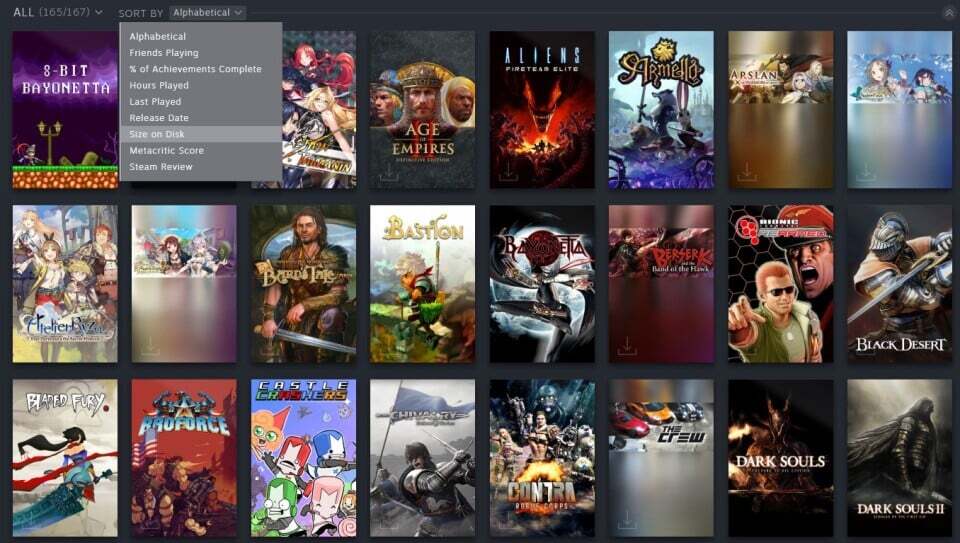이렇게 하려면 라이브러리로 이동하여 게임 목록을 아래로 스크롤하고 정렬 기준 막대를 선택하세요. 드롭다운 메뉴가 열리면 다양한 방법으로 게임을 정렬할 수 있는 유용한 정렬 도구가 표시되지만 지금은 디스크 크기를 선택하세요. 설치된 게임은 각 게임 패널 아래에 크기가 편리하게 표시되어 선반 상단으로 올라갈 것입니다.