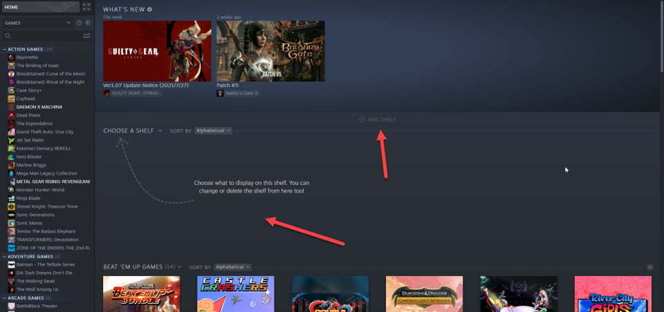 선반은 게임 라이브러리를 보는 또 다른 방법입니다. 라이브러리 추가 > 라이브러리 선택을 클릭하면 모든 컬렉션을 가로 스크롤 라이브러리로 변환할 수 있습니다. 모든 게임 및 최근 친구 활동을 포함하여 컬렉션이 아닌 몇 가지 기본 옵션도 있습니다.