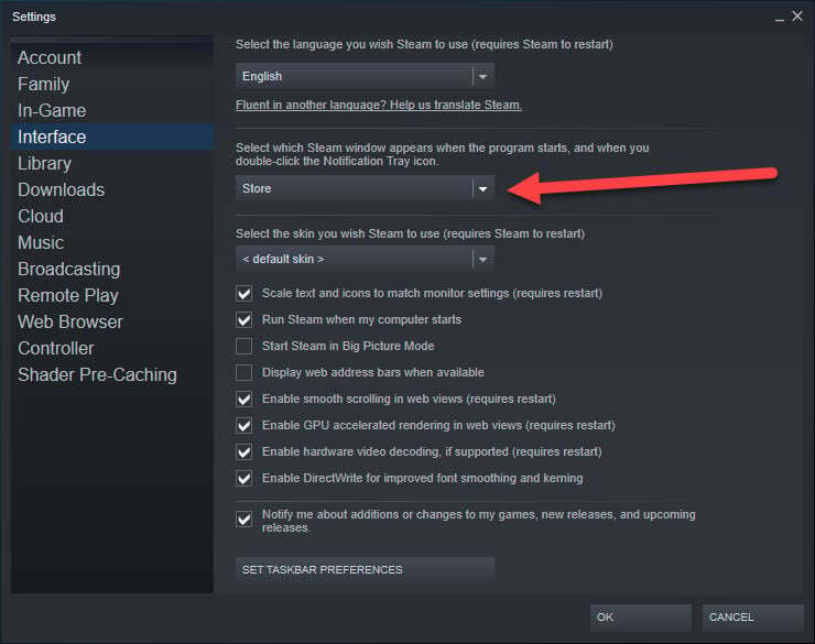 기본적으로 Valve의 상점은 Steam에 로그인할 때 가장 먼저 보게 되는 화면입니다. 그러나 반드시 그럴 필요는 없습니다. Steam > 설정 > 인터페이스 로 이동하여 강조 표시된 드롭다운 상자를 클릭하여 시작 페이지를 변경할 수 있습니다. Store, Library, Friends를 포함한 7가지 시작 페이지 옵션이 제공됩니다.