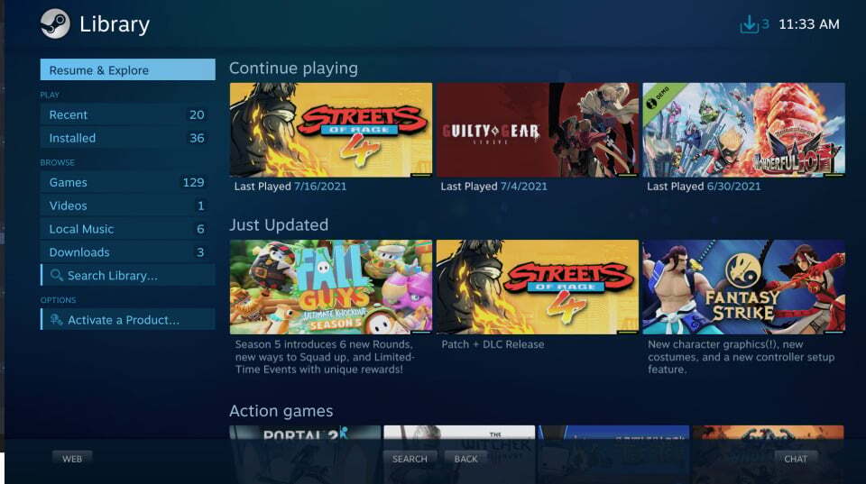 Steam을 엔터테인먼트 센터의 일부로 만들고자 하는 Valve의 열망으로 인해 회사는 대형 화면 모니터 및 TV와 함께 사용하도록 설계된 간소화된 인터페이스인 Big Picture 모드를 만들게 되었습니다.