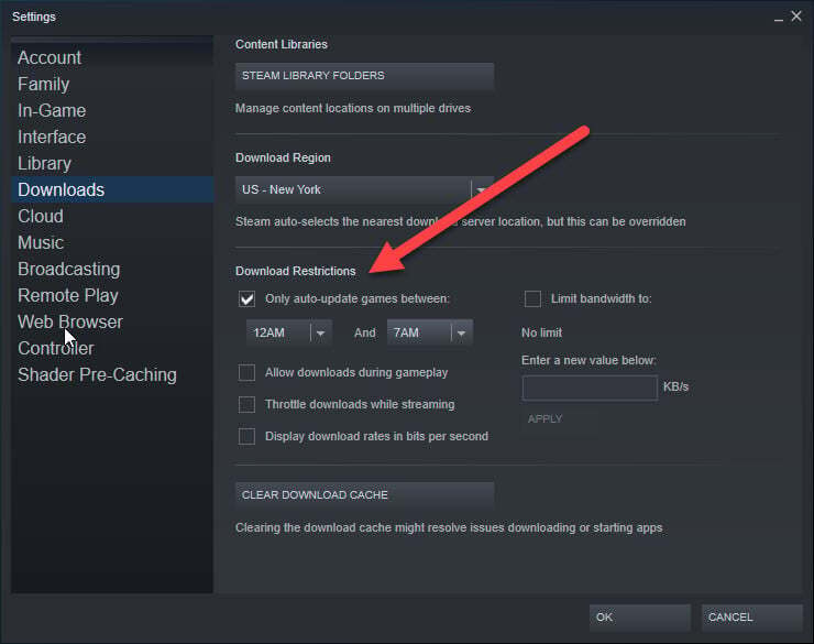개발자는 버그 수정이든 새로운 기능이든 지속적으로 게임 업데이트를 내보냅니다. 결과적으로 구매한 타이틀을 업데이트하라는 Steam 메시지를 많이 받게 됩니다. 다행히도 이 앱을 사용하면 패치를 다운로드할 시간을 선택할 수 있습니다. Steam > 설정 > 다운로드를 방문하여 시간을 설정할 수 있습니다.