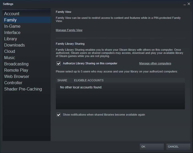 Steam > 설정 > 가족 으로 이동한 후 이 컴퓨터에서 라이브러리 공유 승인 상자를 클릭하여 활성화하세요. 다른 사용자의 승인 요청을 승인하면 해당 사용자는 라이브러리에서 타이틀을 다운로드하고 재생할 수 있습니다. 단, 타사 보안 키가 필요할 수 있는 타이틀은 제외됩니다. 그들은 자신만의 게임 저장도 갖고 있으므로 진행 상황이 망가지는 것에 대해 걱정할 필요가 없습니다.