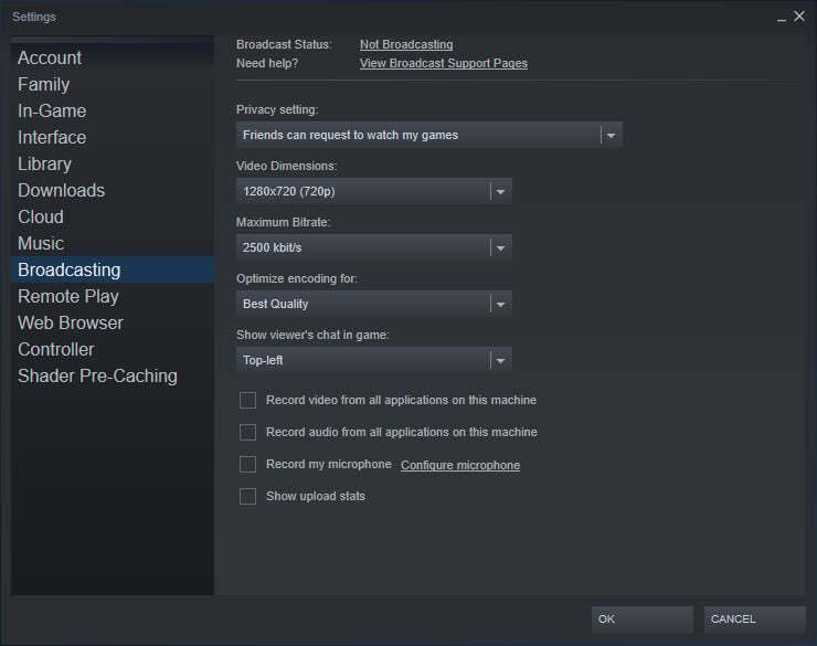 Steam은 Twitch나 Facebook Gaming과 같은 완전한 비디오 게임 라이브 스트리밍 서비스는 아니지만 친구들이 서로 플레이하는 모습을 볼 수 있도록 방송 기능을 제공합니다. Steam > 설정 > 브로드캐스트를 클릭하여 스트림의 비디오 해상도, 개인 정보 보호 설정, 최대 비트 전송률 및 기타 필수 옵션을 조정하세요.