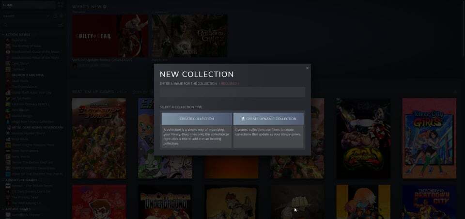 게임 이름을 마우스 오른쪽 버튼으로 클릭하고 추가 > 새 컬렉션으로 이동하면 카테고리(예: 액션 게임 또는 인디 게임)를 만들어 디지털 컬렉션을 구성할 수 있습니다. 컬렉션은 정적이거나 동적일 수 있습니다. 정적 컬렉션을 사용하면 제목을 마우스 오른쪽 버튼으로 클릭하고 메뉴를 따라(또는 새 홈으로 끌어서) 게임을 카테고리로 수동으로 이동할 수 있습니다. 동적 컬렉션을 사용하면 라이브러리가 커짐에 따라 기본 Steam 태그를 기준으로 게임을 자동으로 정렬하는 필터를 적용할 수 있습니다.