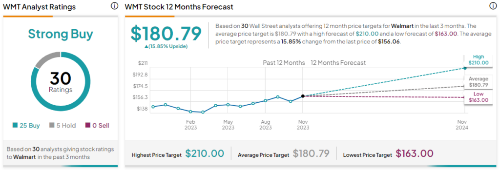 지난 3개월 동안 WMT 주식을 담당하는 애널리스트 30명 중 25명은 매수로 평가했고, 5명은 보류로 평가했습니다. 이 소비재 주식에 대한 매도 추천이 없습니다. 평균 월마트 주가 목표 는 $180.79이며, 이는 향후 12개월 동안 15.9%의 상승 가능성을 의미합니다.