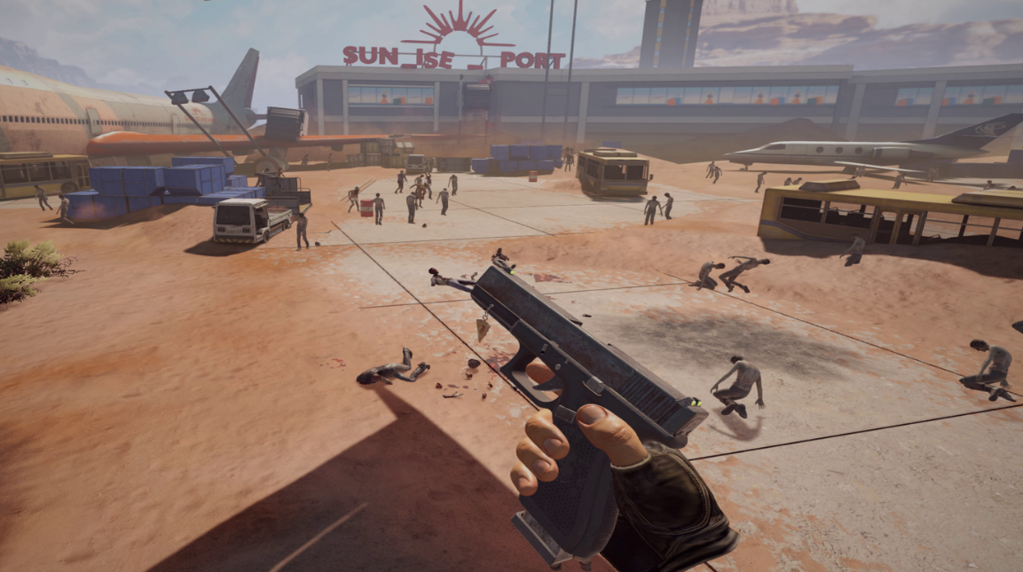 장소에 대해 말하자면, 애리조나 사막 시골 외에도 꽤 괜찮은 다양한 장소가 있는데, 알고 보니 햇빛이 적고 어둠 속에서 싸워야 하는 경우에는 훨씬 다릅니다. 하수구, 상점, 철도역, 공항, 아파트 단지 등은 상당한 다양성을 만들어냅니다. Left 4 Dead의 카니발에서 좀비를 쏘는 것만큼 기억에 남는 일은 없다고 말하고 싶지만 Arizona Sunshine 2에서는 그런 일이 뒤섞여 있습니다. 하지만 손전등을 수동으로 제어할 수 있었으면 좋았을 텐데요. 왜냐하면 많은 지역이 매우 어둡지만 자동으로 켜지는 시점을 결정하는 것은 다르게 생각하기 때문입니다.