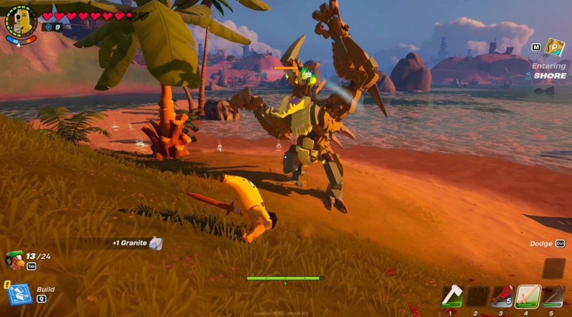 전투는 마인크래프트나 발하임과 같은 투박한 스타일입니다. 주로 서서 방패로 적의 공격을 막는 사이에 칼로 적을 때리고 필요할 때 약간의 민첩성을 제공하는 회피 롤을 사용합니다. 레고 포트나이트는 NPC를 사용하여 여기에서도 위험을 약간 낮추었습니다. 친근한 캐릭터를 모집하여 함께 탐험할 수 있으며 즉시 전투 확률을 두 배로 늘릴 수 있습니다. NPC가 죽으면 몇 초 후에 NPC가 다시 생성됩니다. 진입 장벽과 위험을 낮추면서 모험적인 느낌을 유지하는 옵션입니다.