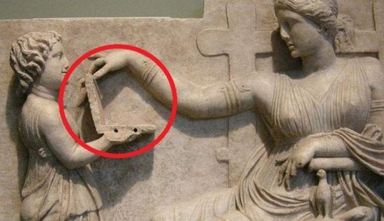 역사를 다시 쓰는 데있어 대학원생이할 수 있는 특이한 과시는 오늘날 유명한 로스 안젤레스 게티 미술관에 있습니다. 그레코 - 로마 시대의 대리석 조각은 두 사람을 묘사하며, 그 중 하나는 완전히 설명할 수 없는 다른 것을 보여주거나 발표합니다. 이 아이템은 오른쪽에 두 개의 둥근 커넥터가 있는 현대 노트북과 매우 유사합니다.