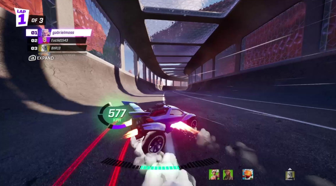 로켓 리그 연계로 인해 혼란스러워하지 마십시오. 로켓 레이싱은 물리학을 무시하는 스턴트를 수행하는 장난감 자동차도 포함한다는 점에서 Psyonix가 개발한 이전 게임과 연관성을 공유합니다. 대신 로켓 레이싱은 Distance, Rollcage, Wipeout 및 GRIP: Combat Racing 과 같은 게임에서 영감을 세련되게 차용했습니다. 지도에는 12대의 자동차가 있는데, 각각은 결승선에 먼저 도달하려고 합니다. 매우 표준적인 방식이지만 로켓 레이싱에서는 이 공식을 변형하여 드리프트를 하면 Mario Kart 와 유사한 부스트 미터가 채워져 경쟁에서 승리한 후 빠르게 지나갈 수 있습니다. 추진력은 충분하다. 비슷한 전투 레이서에서 볼 수 있는 아이템이나 무기가 지도에 없습니다. 대신, 당신의 유일한 초점은 선택적으로 드리프트하고, 부스트하고, 일반적으로 속도를 늦추는 다른 플레이어나 장애물을 피하면서 최대 속도를 유지하는 것입니다.