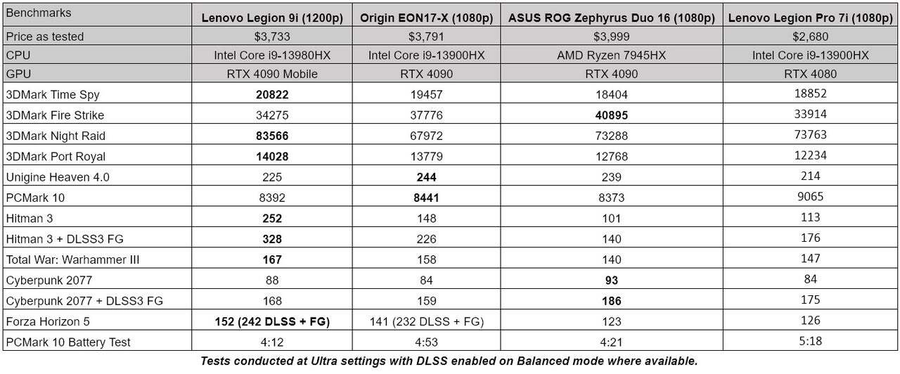 합성 테스트에서는 거의 모든 테스트에서 1위를 차지했습니다. 이것이 성능과 효율성 코어를 작동시키는 Core i9-13980HX이며 이 노트북에서 기대할 수 있는 성능의 좋은 예입니다. 3DMark Fire Strike 및 PCMark에서는 Origin EON17-X에 뒤처졌지만(머리카락만 차이난다면) 실제 프레임 속도의 절충으로 인해 제 생각에는 3.2K 해상도가 놀라워 보이고 달리기가 훨씬 쉬워졌습니다.