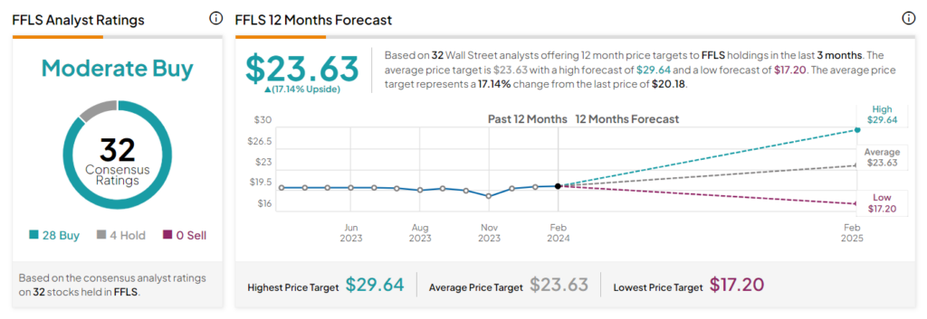 FFLS는 보통 매수 합의 등급을 받았습니다. 보유 주식 32개 중 28개는 매수, 4개는 보류 등급입니다. 평균 FFLS ETF 목표 가격 $23.63은 현재 수준보다 17.1%의 상승 여력이 있음을 의미합니다. ETF는 지난 3개월 동안 7.1% 상승했다.