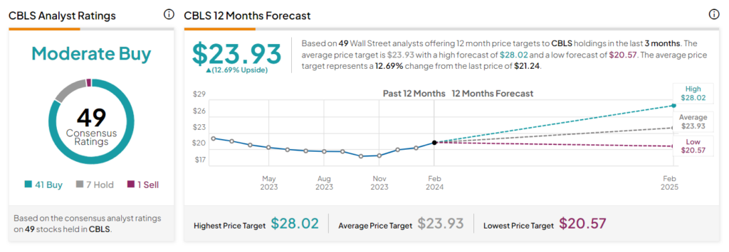 분석가들의 평가에서 CBLS ETF는 보통 매수 합의 등급을 받았습니다. 이는 포트폴리오에 포함된 각 주식의 컨센서스 등급을 기반으로 합니다. 보유 주식 49개 중 41개는 매수, 7개는 보류, 1개는 매도 등급입니다. 평균 CBLS ETF 가격 예측 $23.93은 현재 수준보다 12.7%의 상승 여력이 있음을 의미합니다. CBLS ETF는 지난 3개월 동안 12.1% 상승했습니다 .