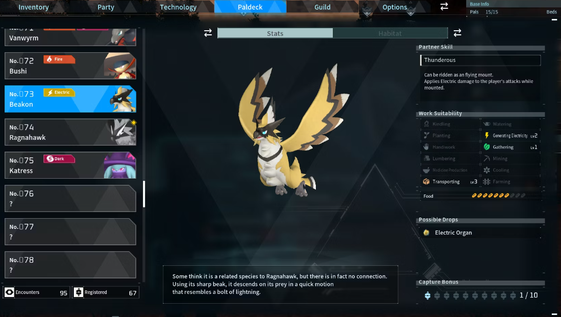 Lv. 34에 도달하면 Vanwyrm의 비행 속도가 만족스럽지 않다면 Beakon을 얻으려고 노력해야 합니다. 이 Electric Pals는 스프린트 버튼을 누른 상태에서 비행하면 훨씬 더 빠르기 때문에 장거리 여행에 이상적입니다. 비콘은 기지에 전기를 생산할 수 있는 Pal을 찾고 있는 경우에도 좋습니다.