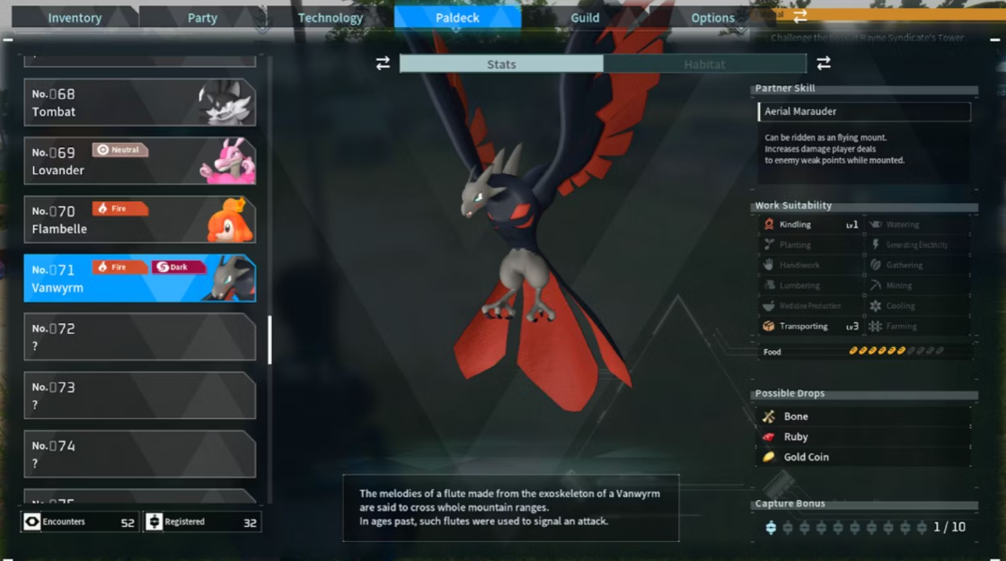 나이트윙(Nitewing)은 많은 플레이어에게 첫 번째 비행 탈것이 될 가능성이 높지만 Vanwyrm은 속도 면에서 첫 번째 직접 업그레이드가 될 것입니다. 이 화염 타입 친구들은 나이트윙보다 약간 빠르지만 그 차이는 여전히 눈에 띕니다. 또한 전투, 특히 얼음과 풀 타입 친구와의 전투에 매우 강합니다.