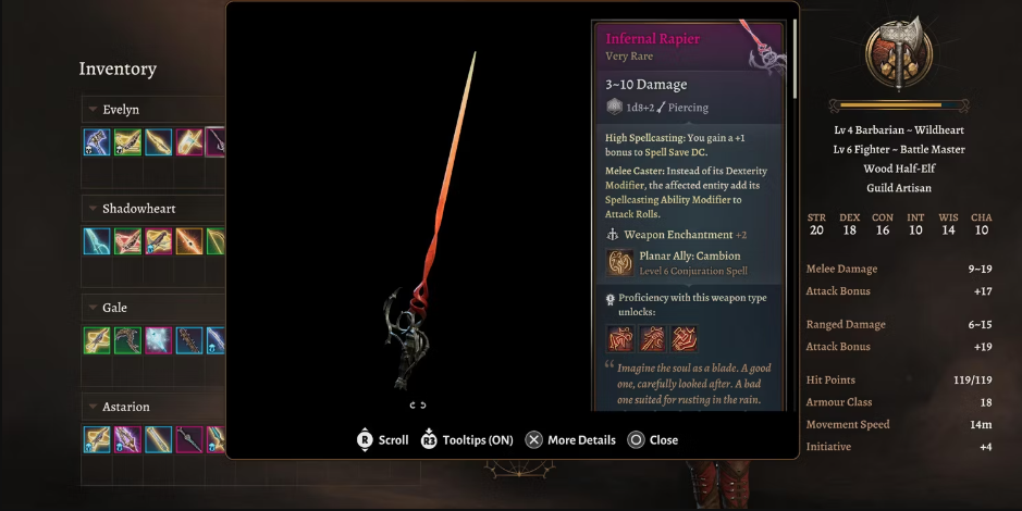윌(Wyll)을 데려오지 않는 것은 많은 사람들이 놓칠 수 있는 일이며, 이 비밀 보물은 영원히 사라질 것입니다. Infernal Rapier는 Spell Save 및 Melee Caster 수정자에 +1 보너스가 있기 때문에 꽤 괜찮은 무기입니다. 게다가 꽤 멋져 보이기도 합니다.