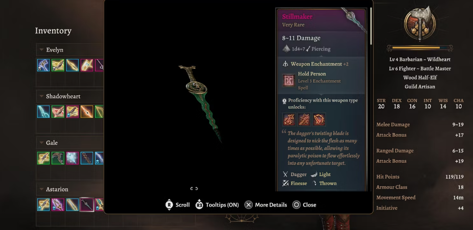 플레이어는 이 단검을 얻으려면 3막까지 기다려야 하지만, 자신의 하루와 인생을 망칠 수 있을 만큼 목표에 가까이 다가가기 위해 자신을 그림자로 위장하고 자신을 가리는 것을 꺼리지 않는 좀 더 어두운 캐릭터에게는 아주 좋습니다. 필요한 인식 검사를 통과하고 동일한 무기를 찾는 도플갱어를 처치하도록 주의하세요.