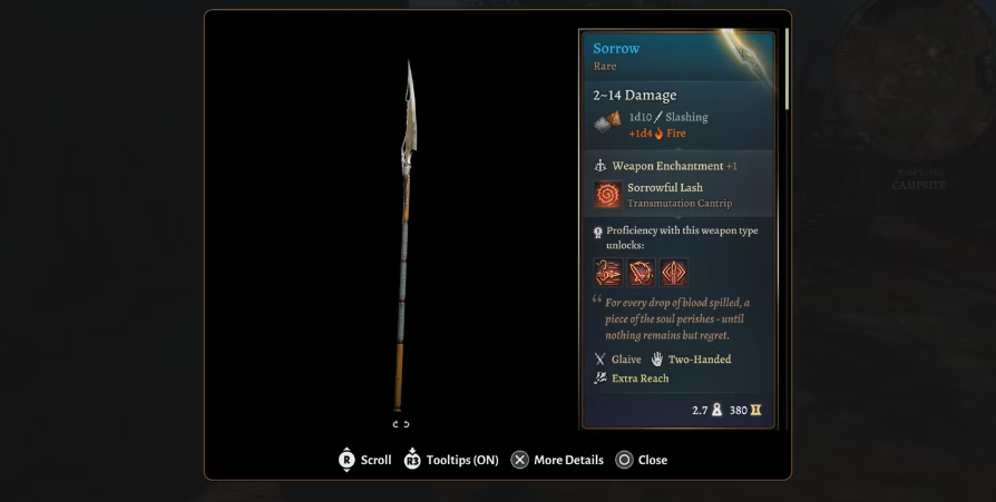 보물 안에서 플레이어는 희귀하고 귀중한 글레이브인 슬픔을 찾을 수 있습니다. 이 글레이브는 플레이어가 더 넓은 범위의 무언가를 찾는 데 도움이 됩니다. 플레이어가 서로우 래쉬를 보너스 액션으로 사용하여 대상을 더욱 가까이 끌어당길 수 있다는 사실은 인상적인 무기에 큰 효과를 더해줍니다.