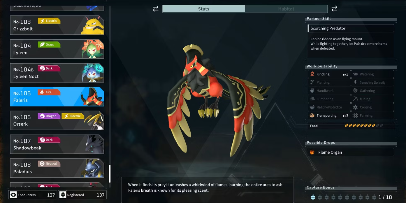 먼저 Pal Faleris가 어떤 유형인지부터 살펴보겠습니다. Faleris는 Paldeck 항목에 따르면 숨결이 매우 좋고 사냥하는 모든 영역을 완전히 불태워 재로 만드는 습관이 있는 순수한 Fire-Element Pal입니다 . 작업자로서 Faleris는 작업 적합성 을 두 개만 가지고 있지만 둘 다 매우 유용합니다. 이것들은 Kindling 3 과 Transporting 3 이며, 둘 다 매우 요구되는 작업 특성입니다.