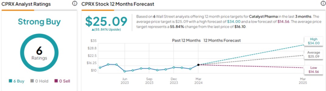 Catalyst 주식에 대한 Strong Buy 합의 등급은 총 6건의 Buy를 기준으로 만장일치로 이루어졌으며, 이는 Gerberry의 동료들이 여기서 강세 전망에 동의한다는 것을 보여줍니다. 주식은 $16.10에 판매되고 있으며 $25.09의 평균 목표 가격은 향후 12개월 동안 56%의 상승 여력을 의미합니다.