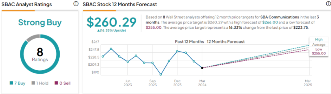 SBA Communications에 대한 최근 기록에는 8개의 애널리스트 리뷰가 있으며 여기에는 Strong Buy 합의 등급에 대한 7개의 Buy와 1개의 Hold가 포함되어 있습니다. 이들 주식의 현재 거래가는 223.75달러이며, 평균 목표가 260.29달러는 BofA 견해와 거의 일치합니다.