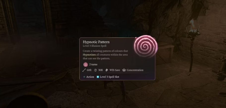 불행히도 발더스 게이트 3(Baldur's Gate 3) 에서는 그렇지 않으며 최면 패턴이 상당히 너프되었습니다. 여전히 꽤 괜찮은 반경을 가지고 있으며, 이를 볼 수 있을 만큼 불운한 대상에게 지혜 내성굴림을 강제로 적용하지만 10턴 동안 지속되는 대신 단 2턴 동안만 지속됩니다. 이는 내성 굴림에 실패한 적이 매우 빠르게 전투에 복귀할 수 있다는 것을 의미하며, 이로 인해 이 주문이 기대했던 것보다 덜 유용해집니다.